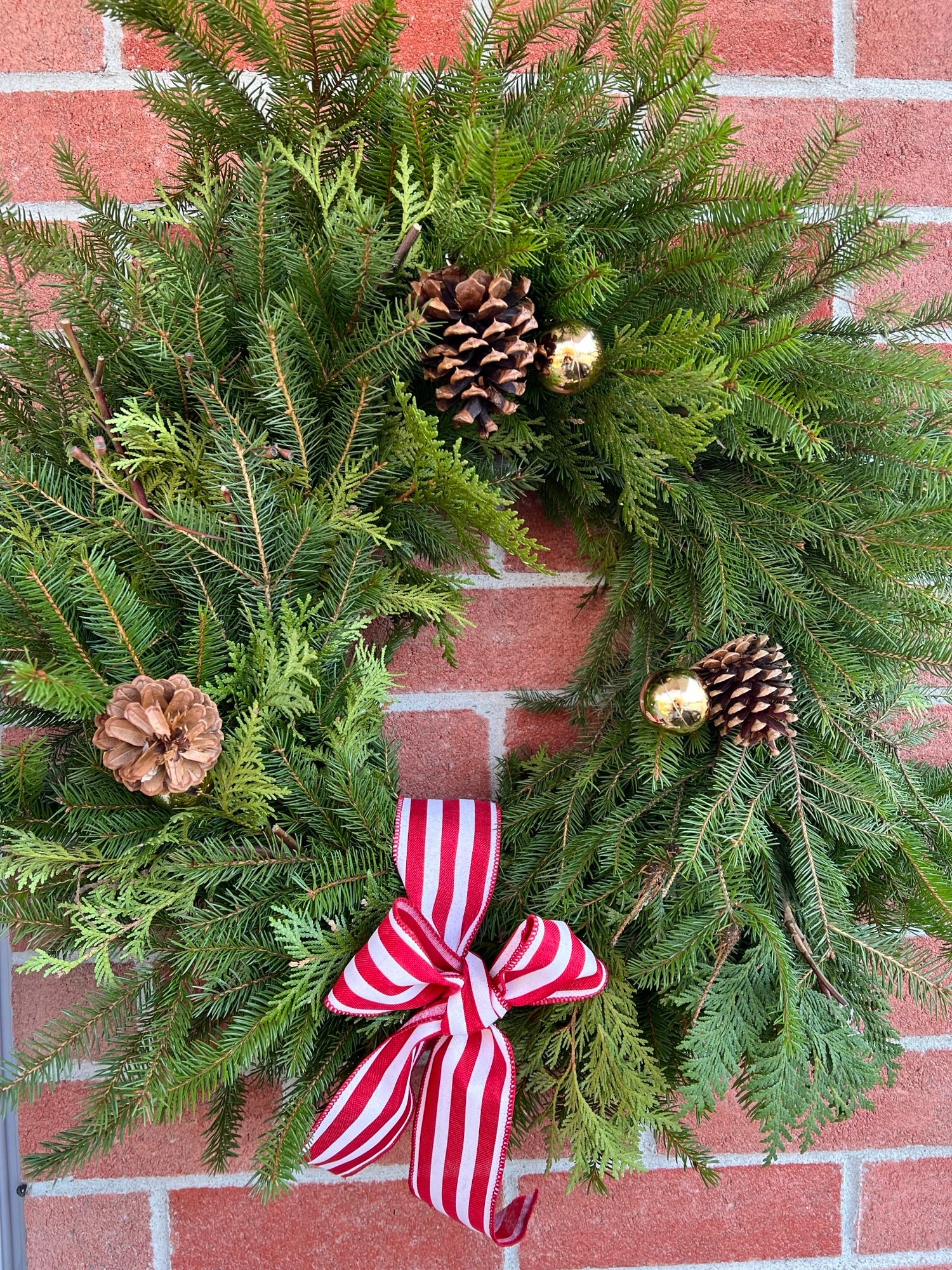Magnifique couronne de sapinage naturel, confectionnée à la main avec une inspiration festive. Le ruban rouge et les boules de noël sont parfait pour illuminer cette couronne! Parfaite pour décorer votre porte d’entrée, elle apporte une touche naturelle, élégante et chaleureuse à votre maison.